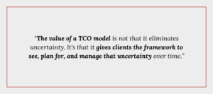 In the same way, we can make very reasonable projections about future costs — grounded in our team’s collective experience, our data, and our professional judgment. But anyone who claims to project future costs with absolute certainty probably doesn’t understand the reality of what they’re doing. The value of a TCO model is not that it eliminates uncertainty. It’s that it gives clients the framework to see, plan for, and manage that uncertainty over time.