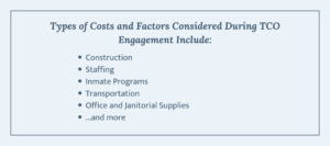 When we engage in a TCO conversation, we try to bring in a cross-section of the people who will be affected by and responsible for the facility’s finances over time. That means people from the operations side – wardens, detention directors – the people who will actually be running the facility day to day. It means facility managers who understand the physical plant, and county finance staff who will typically grasp the financial framework most quickly. And ideally, it means at least one decision maker – a commissioner, a city councilperson – someone who will ultimately be the champion for the funding that the TCO model is designed to justify.