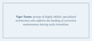 This is where Tiger Teams come in. Tiger Teams are groups of highly skilled, specialized technicians who address the backlog of corrective maintenance during early transition. These teams travel between facilities, providing rapid, expert-level repairs in trades such as: