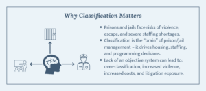 When classification is inconsistent or outdated, everything downstream becomes harder. Housing units destabilize. Staff rely more heavily on instinct than structure. Custody levels inflate. High-security beds fill beyond necessity. Operational costs increase. Litigation risk rises.