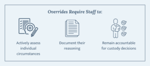 When used appropriately, overrides reinforce staff engagement in the classification process. They require staff to actively assess individual circumstances, document their reasoning, and remain accountable for custody decisions – strengthening both operational awareness and institutional safety.