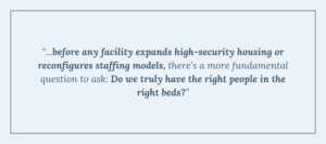When systems expand maximum housing without first examining classification practices, they risk building or staffing expensive capacity that may not actually be needed. But before any facility expands high-security housing or reconfigures staffing models, there’s a more fundamental question to ask: Do we truly have the right people in the right beds?